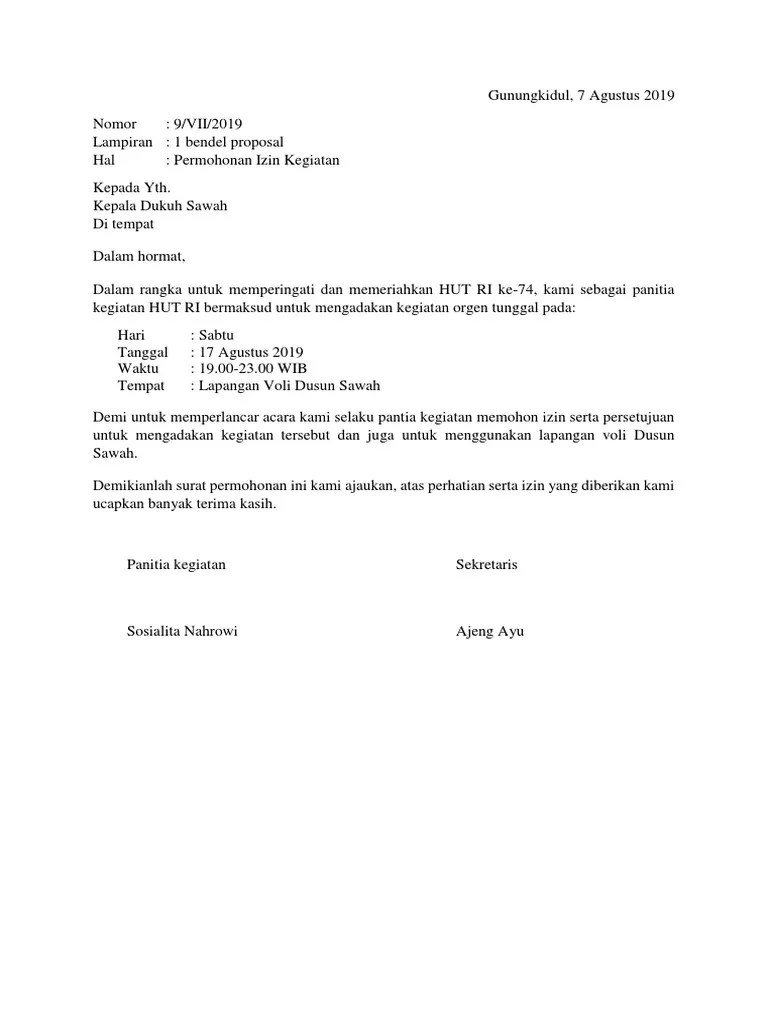 Bersama surat ini, kami bermaksud memohon izin untuk pelaksanaan kegiatan tersebut sekaligus menggunakan balai desa untuk tempat acara. Selain membutuhkan surat izin usaha (siu), ada baiknya anda juga mengurus surat izin tempat usaha (situ). Panitia penyelenggara kegiatan wajib mengirimkan surat permohonan . Contoh format surat pernyataan melakukan kegiatan usaha. Contoh formulir surat izin usaha perdagangan.